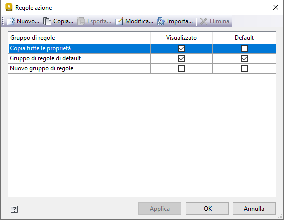 È possibile creare, modificare ed eliminare i gruppi di regole azione nella finestra di dialogo Regole azione.