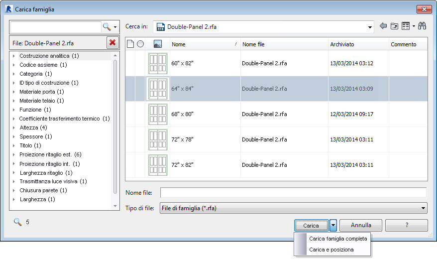 La funzionalità Carica famiglia supporta file di tipo .rfa con o senza i cataloghi dei tipi.