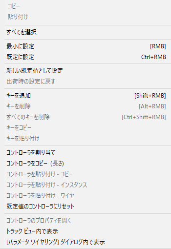 [元に戻す](Undo)や[すべてを選択](Select All)を除き、右クリックすると、次の各コマンドがパラメータで有効になります。最初に値フィールドをクリックする必要はありません。しかし、[コピー](Copy)や[削除](Delete)などの特定のコマンドを使用するには、まず影響される値をハイライトする必要があります。