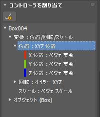 XYZ 位置コントローラは、オイラー XYZ 回転コントローラと同様、X 軸、Y 軸、および Z 軸を 3 つの個別トラックに分割します。したがって、式コントローラからの参照時に、これらの 3 つのトラックを個別に制御できます。