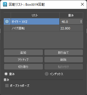 チェックマークが付いていない場合、リスト コントローラは回転ごとに個別に重みを設定し、これらの回転を足し合わせることで、最終的な効果を出します。レイヤの上にレイヤをスタックし、効果の重みを増減して、アニメートします。既定値は、この設定です。