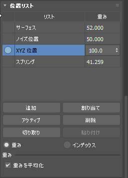コントローラの重みの値を増減させることによって、そのコントローラの影響を大きくしたり小さくしたりします。既定値は 100.0 です。