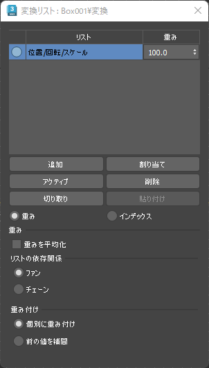 このチェック ボックスにチェックマークを付けると、リスト内のすべてのコントローラの重みが平均化されます。このオプションは、変換リスト、位置リスト、スケール リスト コントローラのみで使用できます。既定値はオフです。