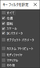 キーを作成したいトラックにチェックマークを付けます。既定では、[位置](Position)、[回転](Rotation)、[スケール](Scale)および[IK パラメータ](IK Parameters)にチェックマークが付いています。