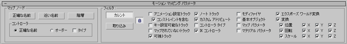 このロールアウトには、アニメーション トラックを自動的にマッピングするためのコントロールと、画面を見やすくするために表示するトラックを絞り込むフィルタを設定するコントロールで構成されます。