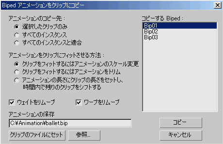 [Biped から](From Biped)を選択すると、[Biped アニメーションをクリップにコピー](Copy Biped Animation To Clip)ダイアログ ボックスが開きます。選択した元のクリップは、Biped のアニメーションに置き換わります。