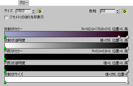 放射状、円形状、透明度、サイズの各グラデーションを制御します。グローのグラデーションは、フレアのグラデーションより細かいグラデーションになります。グローのグラデーションの場合は、1 ピクセル以上の領域を使用するからです。