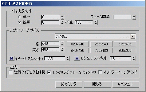 [ビデオ ポストを実行](Execute Video Post)ダイアログ ボックスのコントロールは、[レンダリング設定](Render Setup)ダイアログ ボックスのコントロールと似ていますが、設定が独立しているため相互の影響はありません。
