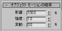 エミッタのモーションがパーティクルのモーションに及ぼす影響の大きさを修正します。このパラメータは正の値または負の値を指定できます。