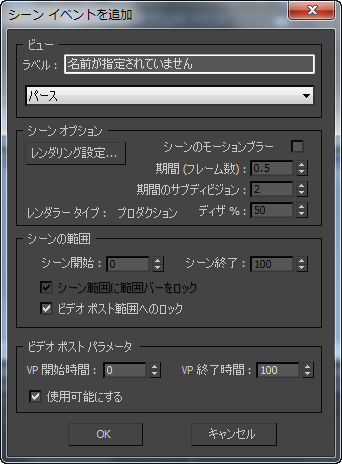 [シーン イベントを追加](Add Scene Event)ボタンを使用すると、選択したカメラ ビューポート内のシーンをキューに追加できます。シーン イベントは、現在の 3ds Max シーンのビューです。表示するシーンや最終ビデオにシーンを同期させる方法を選択できます。イメージ入力イベントのように、シーン イベントではキュー内にイメージが 1 つ配置されます。ただし、シーン イベントは現在の 3ds Max シーンなので、ビデオ ポスト キューを実行するとレンダリングされます。シーンは、以下で説明するオプションをして、スキャンライン レンダラーと全く同様にレンダリングされます。レンダリング結果のシーン イメージには、アルファ チャネルが含まれます。