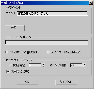 警告: 外部イベントによりクリップボードから読み込まれたイメージは、ビデオ ポストキューに置かれます。外部プログラムが予定どおりに作動しない場合、ビデオ ポストのすべてのポスト プロセスの結果を消去または上書きすることがあります。
