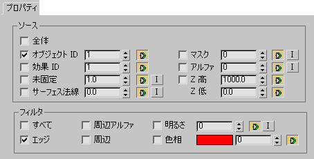 - 輝度の値に基づいてソース オブジェクトにフィルタをかけます。この編集ボックスの設定値より大きな明るさを持つオブジェクトのみ選択されハイライトされます。編集ボックスの横にある[I]ボタンをクリックすると、このオプションを反転できます。このパラメータはアニメートできます。