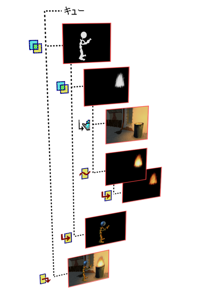 ビデオ ポスト キューには、合成するためのシーンのジオメトリ、バックグラウンド イメージ、効果、およびマスクを格納できます。