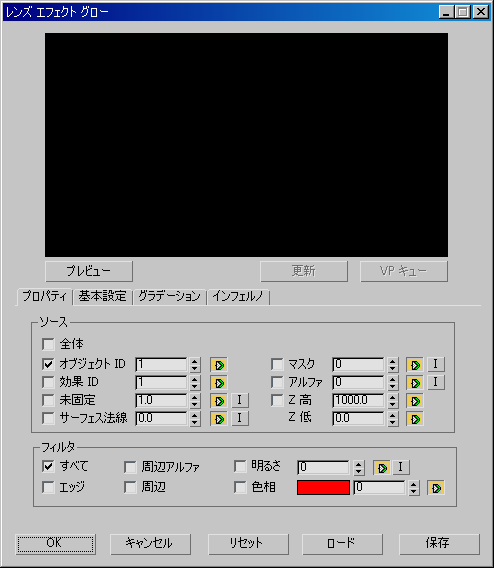 [レンズ エフェクト グロー](Lens Effect Glow)ダイアログ ボックスには 4 つのパネルがあります。プロパティ、基本設定、[グラデーション](Gradients)、[インフェルノ](Inferno)です。