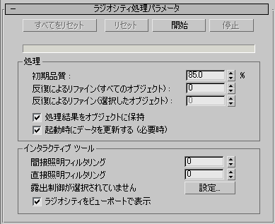 - [開始](Start)をクリックすると、3ds Max シーンのコピーがラジオシティ エンジンにロードされます。 [すべてをリセット](Reset All)をクリックすると、すべてのジオメトリがエンジンから削除されます。