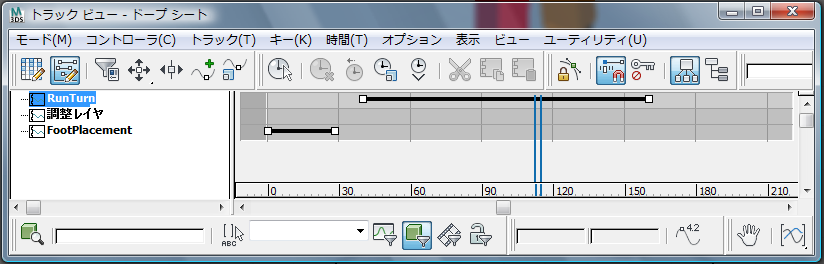 [範囲: ドープ シート](Ranges: Dope Sheet)を選択します。 3ds Max によって[範囲](Ranges)ツールバーが開きます。