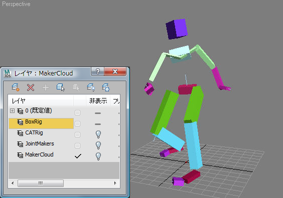 2 番目のレイヤは、関節の角度を定義するボックス リグです。ボックスは関節位置と、回転を定義するルックアット コントローラに拘束されています。多数のボーンの正確な位置は重要ではありません。たとえば、膝の関節は寛骨と関連して動きますが、このデータを CATRig 上にマッピングすると、寛骨の IK システムによってモーションが効率的にクリーン アップされ、関節位置がロックされます。