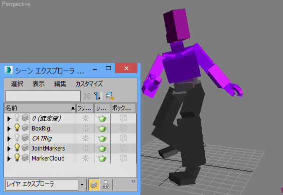 [キャプチャ アニメーション](Capture Animation)ツールを使用して、CATRig をボックス リグにマッピングした例。