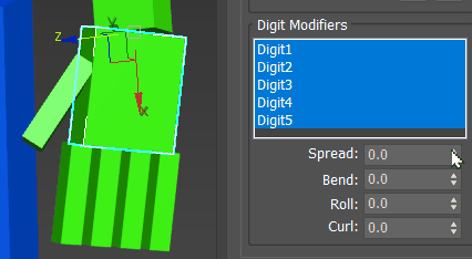 [指モディファイヤ](Digit Modifiers)領域には、指を個別に、またはグループとして操作できるツールがあります。選択された指は、[広がり](Spread)、[ベンド](Bend)、[ロール](Roll)、[カール](Curl)スピナーで、パラメトリックに変形できます。