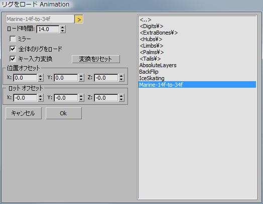 ロード時にポーズに変換を適用できます。[Pos Offset]フィールドと[Rot Offset]フィールドを使用して、保存されているポーズ データからの変換を値で指定します。たとえばポーズをオリジナルとまったく同じ位置にロードしてループ モーションを作成したり、移動と回転のオフセットを指定するといったことが可能です。