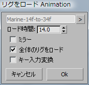 ポーズ ファイルやアニメーション ファイルをロードする際は、すべてのロード パラメータが「ライブ」になります。ロードするファイルやタイミングといった各種パラメータを変更して、ポーズをどのようにロードするかを指定できます。また、タイム スライダをスクラブしてポーズやアニメーション データのロード結果を確認した上で、[OK]をクリックして結果を適用することもできます。