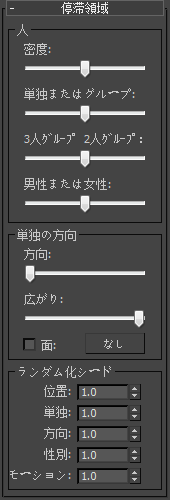 Populate において停滞領域とは、シミュレートされた人々がその場で立ち止まったり、他の人と交流したりする場所のことをいいます。表示される機能には、交流する人々のグループを示す円、各キャラクタの場所を示すマーカー、開始方向、および性別(赤は女性、青は男性)があります。