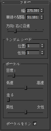 Populate においてフローとは、シミュレートされた人々が歩く道です。表示される機能には、人々が歩くレーンを示すライン、各歩行者の開始点を示すマーカー、移動の方向、および性別(赤は女性、青は男性)があります。マーカーは、レーンおよびランプの終点にも表示されます。