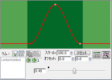スライダを左に動かすと、ダーク グリーンの領域でカーブが狭くなります。つまり、足がより長く地面に留まるようになり、「木星上での歩行」のような効果が作成されます。