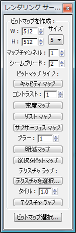 このダイアログ ボックスは、オブジェクトの UVW マッピングに基づいてビットマップを作成する一連のツールを提供します。ビットマップは、オブジェクトの特定のサーフェス プロパティを表示します。また、[ビットマップ選択](Bitmap Select)機能を使用し、マッピング アトリビュートに基づいてサブオブジェクトを選択することもできます。