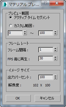 [マテリアル プレビューを作成](Create Material Preview)ダイアログ ボックスは、[プレビューを作成](Make Preview)をクリックしてアニメートされたマテリアルをプレビューするときに表示されます。既定では、このプレビューは ¥previews サブフォルダに _medit.avi という名前で保存されます。次に[プレビューを作成](Make Preview)を使用したときに上書きされないようにするには、[プレビューを保存](Save Preview)でプレビューに別の名前を付けます。