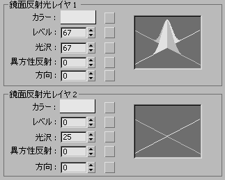 2 本の交差するカーブは、レベル、光沢、および異方性反射の値の調整効果を表します。[光沢](Glossiness)の値を小さくするとカーブの幅は広がり、[鏡面反射光レベル](Specular Level)の値を大きくするとカーブの高さが増します。[異方性反射](Anisotropy)の値を調整すると、ハイライトの幅を表す白いカーブが変化します。