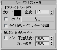 [シャドウ パラメータ](Shadow Parameters)ロールアウトは、スカイライトと IES スカイ以外のすべてのライトのタイプと、すべてのシャドウ タイプに表示されます。このロールアウトでは、シャドウ カラーおよび一般的なシャドウ プロパティを定義できます。