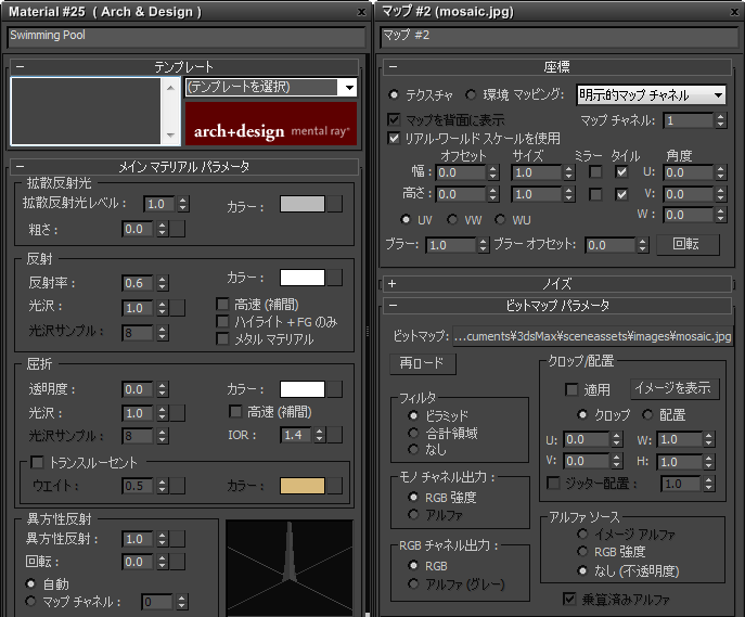 マテリアルおよびマップには、調整可能なさまざまなパラメータがあります。マテリアルまたはマップのパラメータを確認するには、ノードをダブルクリックします。パラメータ エディタにパラメータが表示されます。