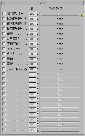 このロールアウトを使用すると、マップまたはシェーダを標準マテリアル パラメータの多くに割り当てることができます。パラメータが最初に表示されるロールアウトでマップおよびシェーダを割り当てることもできます。このロールアウトの主な価値は、マップを削除することなく、チェック ボックスを使用してパラメータのシェーダを切り替えることもできるという点です。