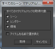 このオプションを選択すると、3ds Max が[すべてのシーン マテリアル/マップを取得](Get All Scene Materials/Maps)ダイアログ ボックスを開きます。