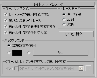 レイトレースがオフでも、[レイトレース](Raytrace)マテリアルと[レイトレース](Raytrace)マップでは、シーンの環境マップや[レイトレース](Raytrace)マテリアルに割り当てられた環境マップを含めた環境の反射や屈折が行われます。