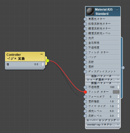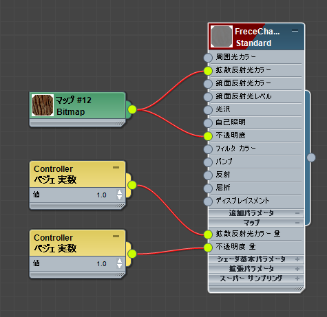 [標準](Standard)マテリアルのコンポーネントをマップする場合、スレート マテリアル エディタでは適切なコントローラ ノードが自動的に追加されます。たとえば、マテリアルの[拡散反射光カラー](Diffuse Color)コンポーネントにビットマップをワイヤリングする場合、[拡散反射光カラー量](Diffuse Color Amount)パラメータの[ベジェ実数](Bezier Float)コントローラも表示されます。これらのコントローラを確認するには、追加パラメータを表示する必要があります。(マテリアル ノードを右クリックして、[すべてを表示 追加パラメータ](Show All Additional Params)を選択します。)