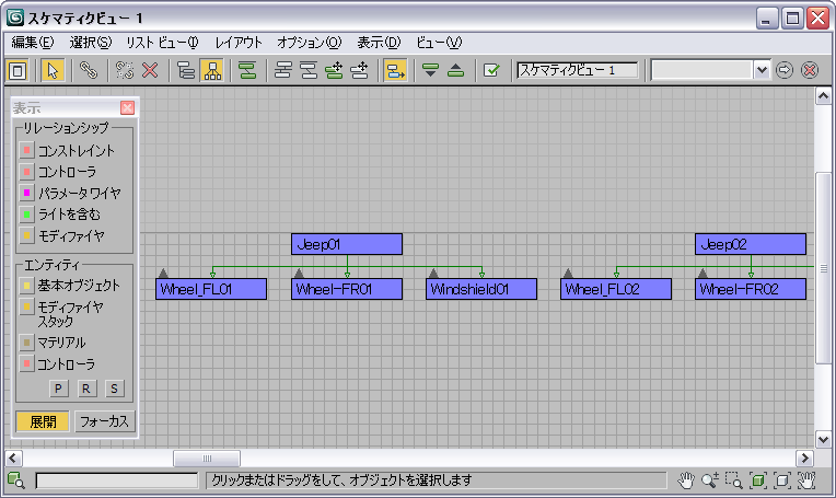 ここでは、オブジェクト間の関係を表示、作成、編集できます。階層の作成や、コントローラ、マテリアル、モディファイヤ、または制約条件の割り当てができます。