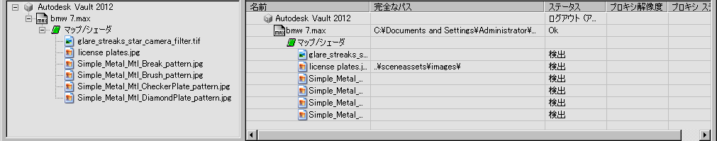 また、アセットのタイプ(3ds Max シーン ファイル、マップ ブランチなど)とステータスを示すアイコンが、アセットごとに表示されます。ほとんどのステータス アイコンについては、「Vault Explorer ヘルプ」(Vault Explorer Help)