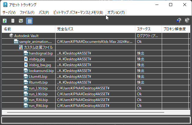 [アセット トラッキング](Asset Tracking)ダイアログ ボックスには、現在のシーン アセットのすべてのリストが、現在の設定に応じてツリー ビューまたはテーブル ビューで表示されます。リストには、シーン ファイル、シーンで使用されるマテリアルなどに含まれるイメージ、外部参照、フォトメトリック ファイルなどのアセットが表示されます。既定では、レンダリング イメージなどの出力ファイルもこのウィンドウ リストに表示されます。これらの表示は、必要に応じて無効にできます。