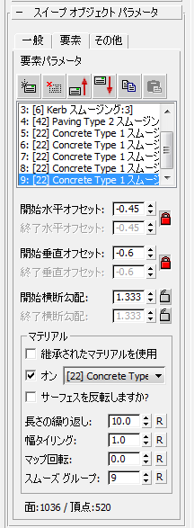 このタブのコントロールでは、スイープ オブジェクト プロファイルの要素のパラメータを編集できます。 各要素は、スイープ オブジェクトの単一のサーフェスであり、水平オフセットと垂直オフセット、独立したマテリアル チャネル選択の機能があります。