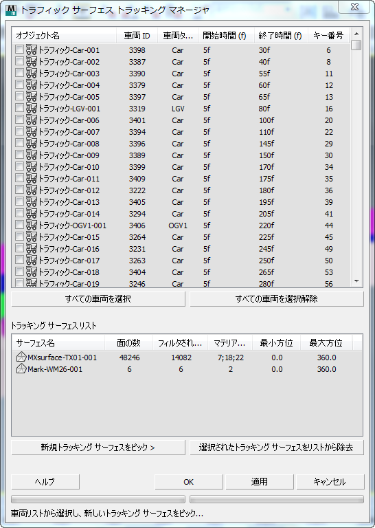 トラックするサーフェスは複数ピックできます。 これは、基本の地表サーフェスの一部を形成していない構造(橋梁路面など)を車両が通過する場合に特に重要です。
