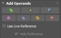 [ブール演算](Boolean)モディファイヤを基本オブジェクトに適用した後で、[オペランドを追加](Add Operands)ロールアウトを使用してブール演算を実行できます。ブール演算ボタンのいずれかをクリックして、シーン内のオペランド(オブジェクト)の選択を開始します。