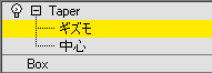 このサブオブジェクト レベルでは、ギズモをその他のオブジェクトと同じように変換およびアニメートして[テーパ](Taper)モディファイヤの効果を変更できます。ギズモを変換すると、中心も同じ距離だけ変換されます。ギズモの回転またはスケールは、中心と関連して行われます。