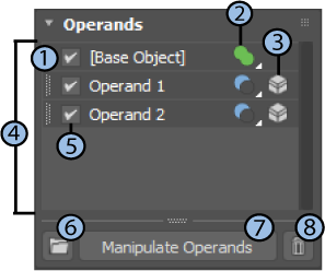 Boolean モディファイヤの[オペランド](Operands)ロールアウトには、ブール演算オペランドを編集および整理するコントロールがあります。