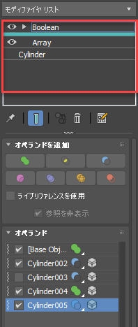 [修正](Modify) > 項目を選択 > [モディファイヤ リスト](Modifier List) > [オブジェクト空間モディファイヤ](Object-Space Modifiers) > [ブール演算](Boolean) > [オペランド](Operands)ロールアウト