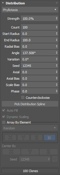 - 既定メニュー: 項目を選択 > [モディファイヤ](Modifiers)メニュー > [パラメトリック変形](Parametric Deformers) > [Array] > [Distribution]ロールアウト > [Phyllotaxis]
