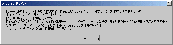Direct3D 用に設定している場合、問題の発生時に「Direct3D の初期化に失敗しました」というメッセージが表示されます。