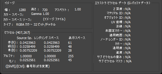 - (ファイルから推測): 埋め込まれたガンマがないため、形式から値が自動的に推測されました。8 ビットおよび 16 ビットの整数形式の場合はシステム ガンマ(通常 2.20)、浮動小数点形式の場合は 1.00 です。