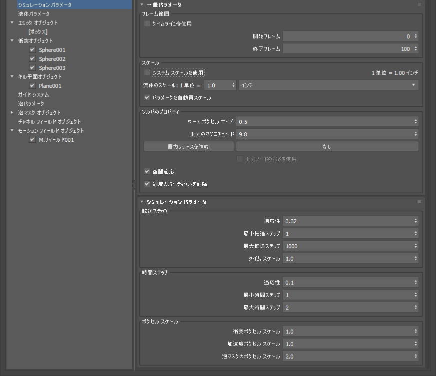 - スケール、ベース ボクセル サイズ、重力設定などのトップレベルのシミュレーション パラメータ、および転送ステップと時間ステップを設定します。